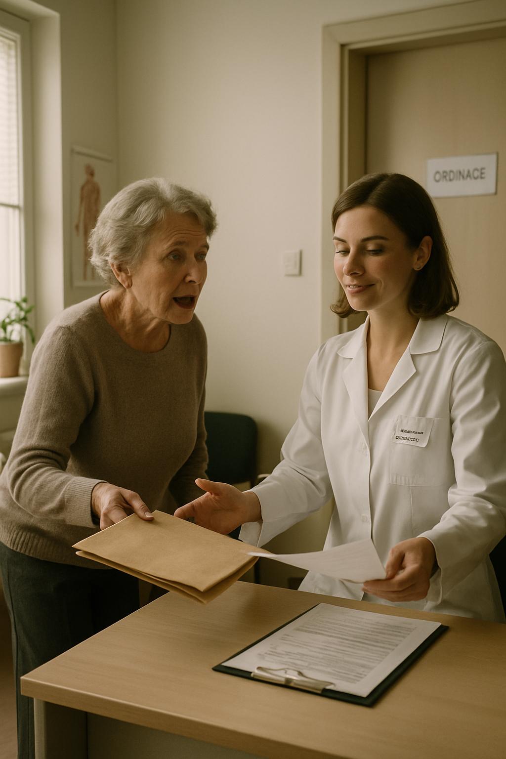 „Všechno mám tady,“ položila před ni objemnou složku. „Jakmile jsem šla do důchodu, zdraví se mi sesypalo. Tlak lítá nahoru dolů, klouby bolí, v noci nespím… za ten rok se toho nastřádalo až dost.“