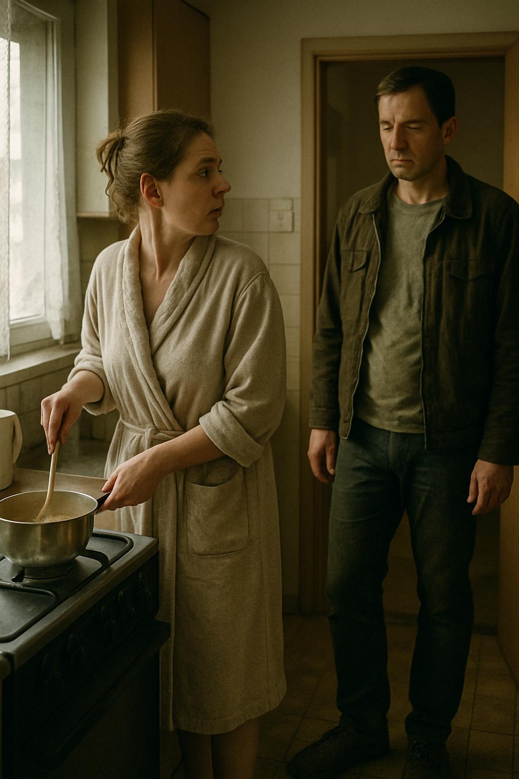 „Jasně, mám hlad!“ odpověděl a vešel dovnitř. Jakmile ji spatřil, na okamžik se zarazil. Stála tam v opraném domácím županu, na nohou sešlapané pantofle a vlasy stažené plastovou sponou.