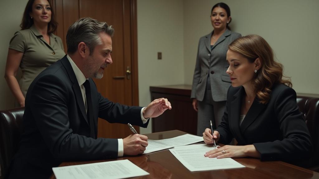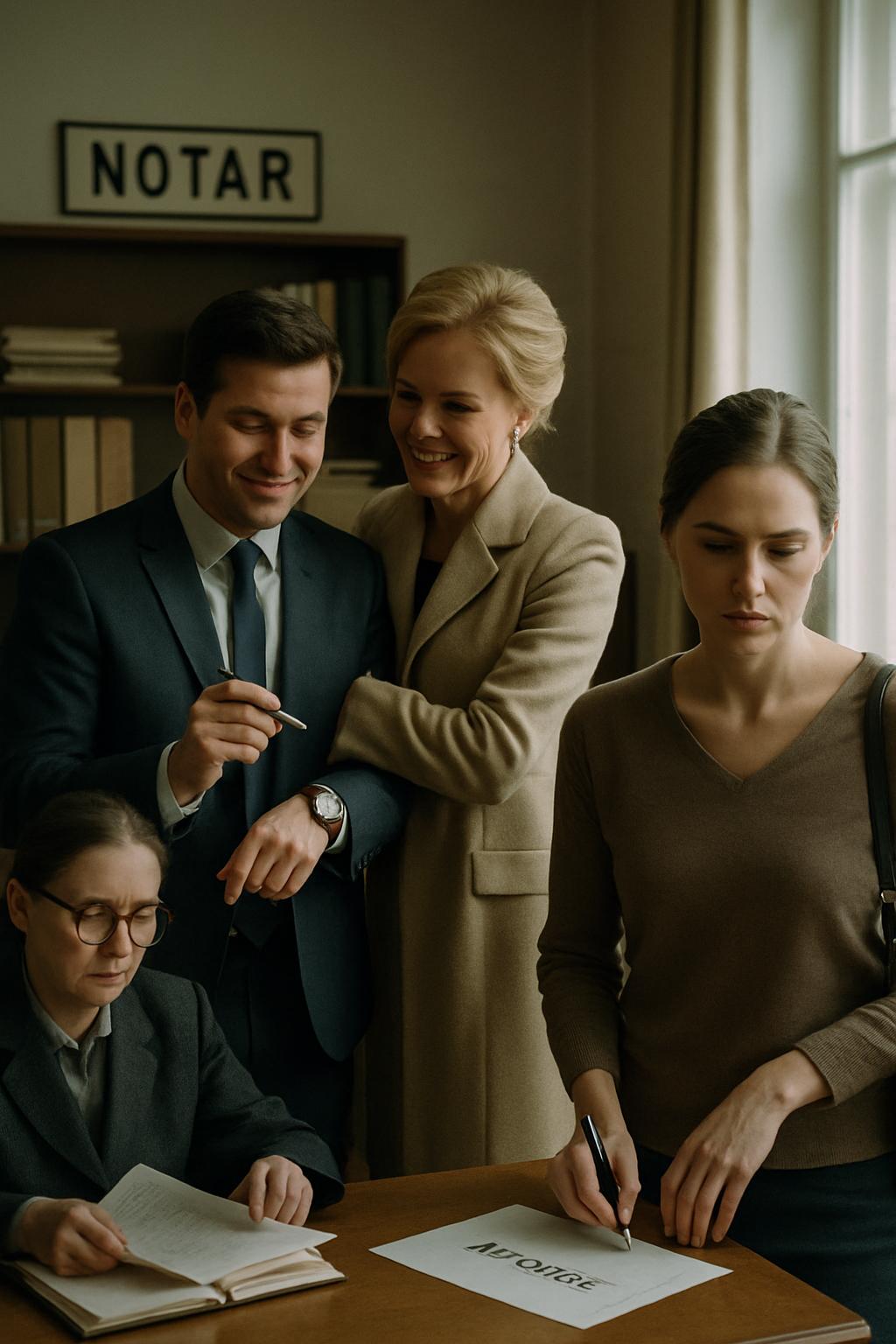 Starší notářka v přísných brýlích působila, jako by okolní napětí vůbec nevnímala. S rutinní pečlivostí obracela listy smlouvy – podobných scén už zažila bezpočet.