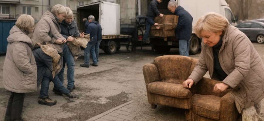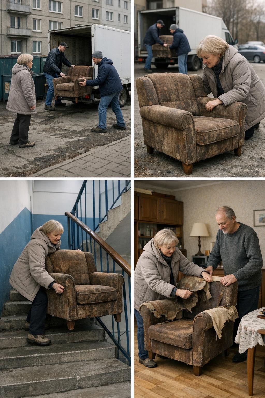Lucie Moravecová sešla dolů s odpadky. Jakmile došla ke kontejnerům, přibrzdil u nich nákladní vůz. Z kabiny vyskočili dva mladí muži, otevřeli korbu a vytáhli z ní staré, ale zachovalé křeslo. Postavili ho stranou a bez dalšího zdržování znovu nasedli a odjeli.