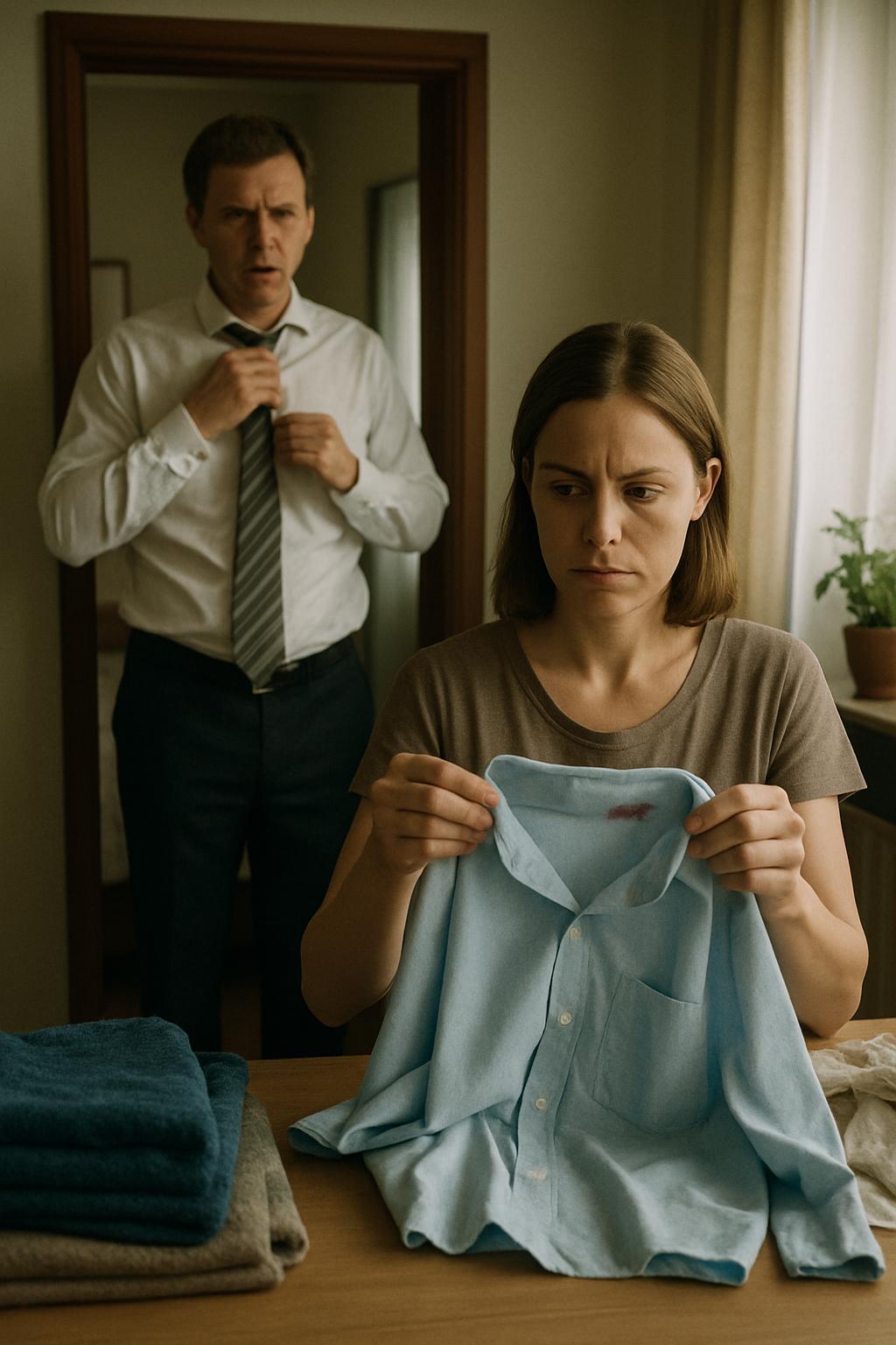 Když přišla na řadu jeho oblíbená světle modrá košile, kterou měl na sobě na pracovním fóru, všimla jsem si na límci tmavé skvrny. Vypadala jako stopa po sytě vínové rtěnce. Takový odstín doma vůbec nemám — používám jen jemné, přirozené barvy.