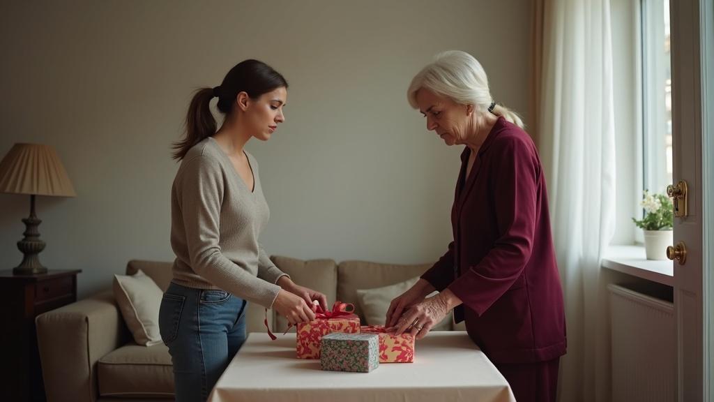 Andrea pomalu zvedla zrak od barevných dárkových krabiček, které pečlivě aranžovala na stole. Ve dveřích stála Helena — její tchyně, oblečená v okázalých bordó šatech.