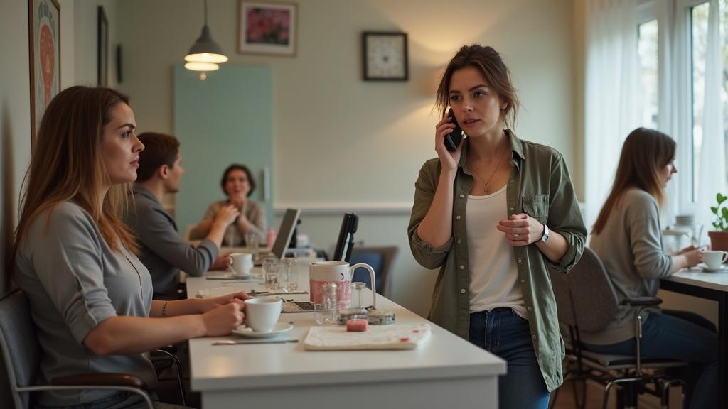 Petra si uvědomila, že její syn reaguje na rozrušeného otce a že v jejich rodince způsobili nepohodlí ostatním návštěvnicím salonu. Začala se chystat k odchodu.