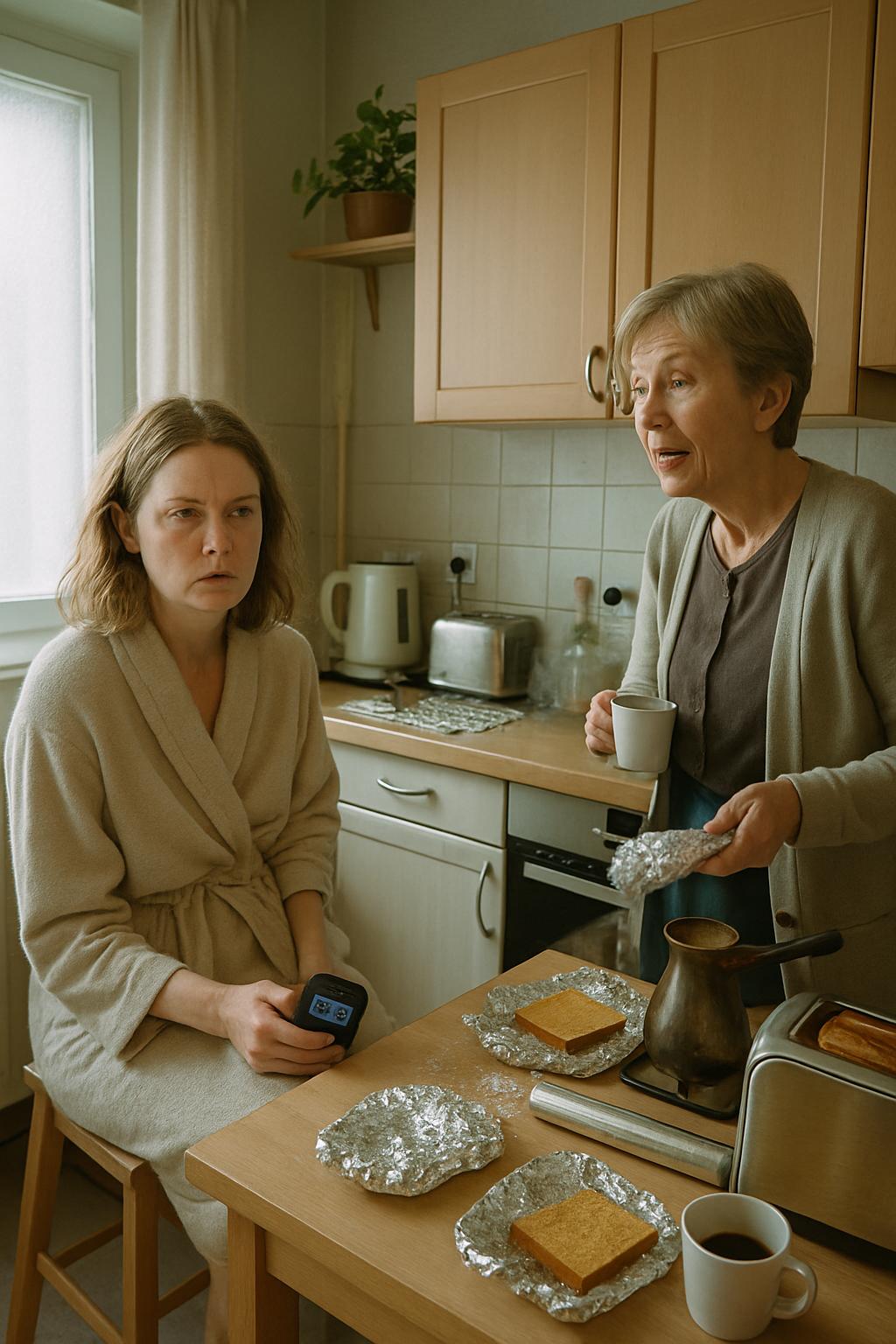 Ale bohužel, o žádný kožich nešlo. Byla to Helena. Se svou rituální ranní rutinou: káva v džezvě, tousty (aniž by se zeptala, jestli může použít toustovač) a hlavně — alobal. Z neznámého důvodu do něj balila VŠECHNO. Dokonce i naměkko vařená vejce.